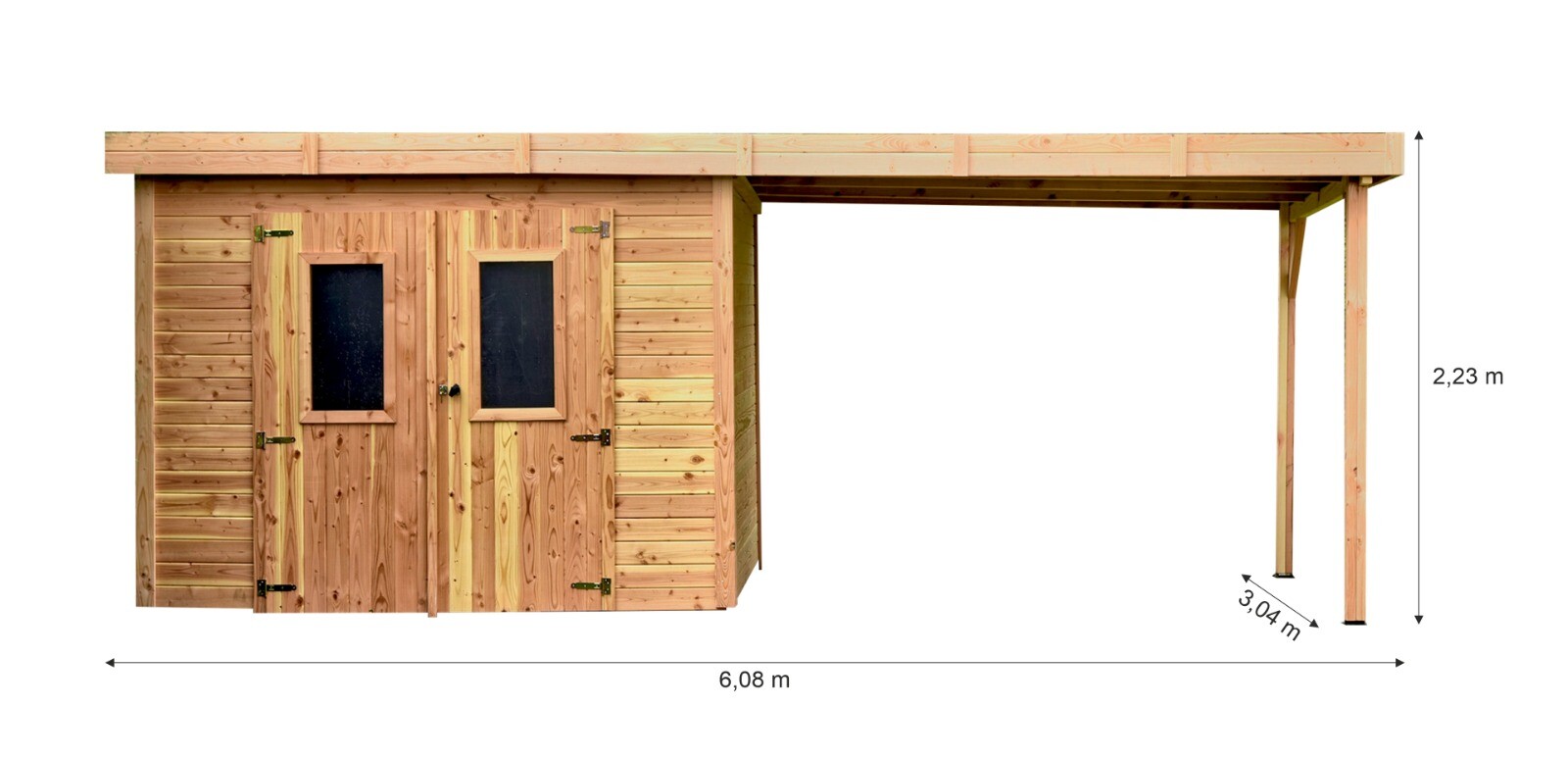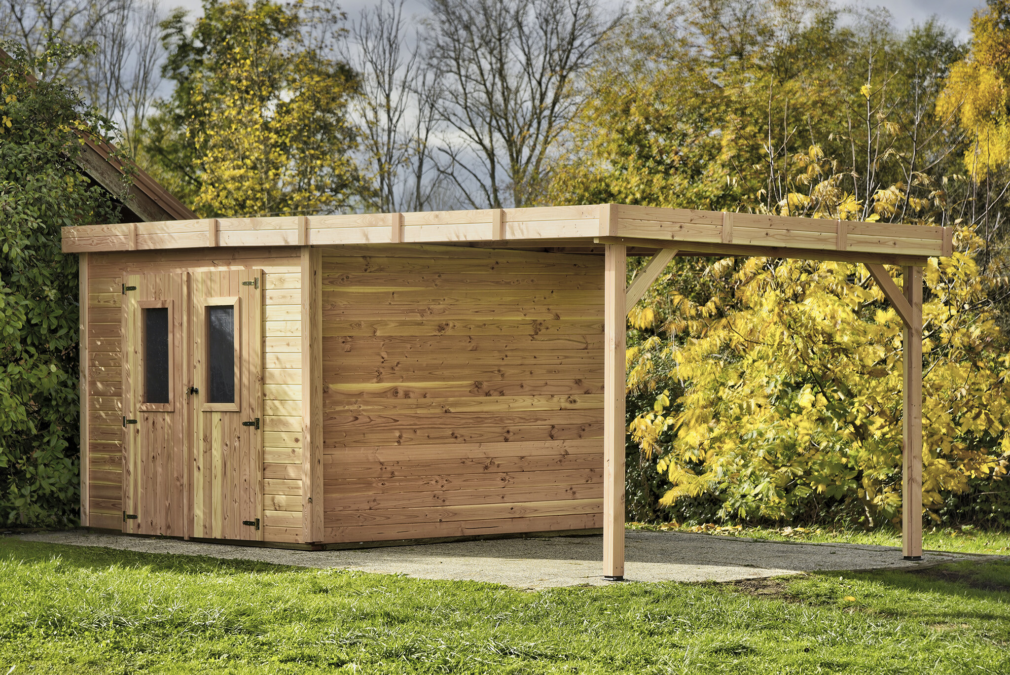 Abri DINAN avec bûcher - douglas - madriers 28mm toit plat - BAC ACIER