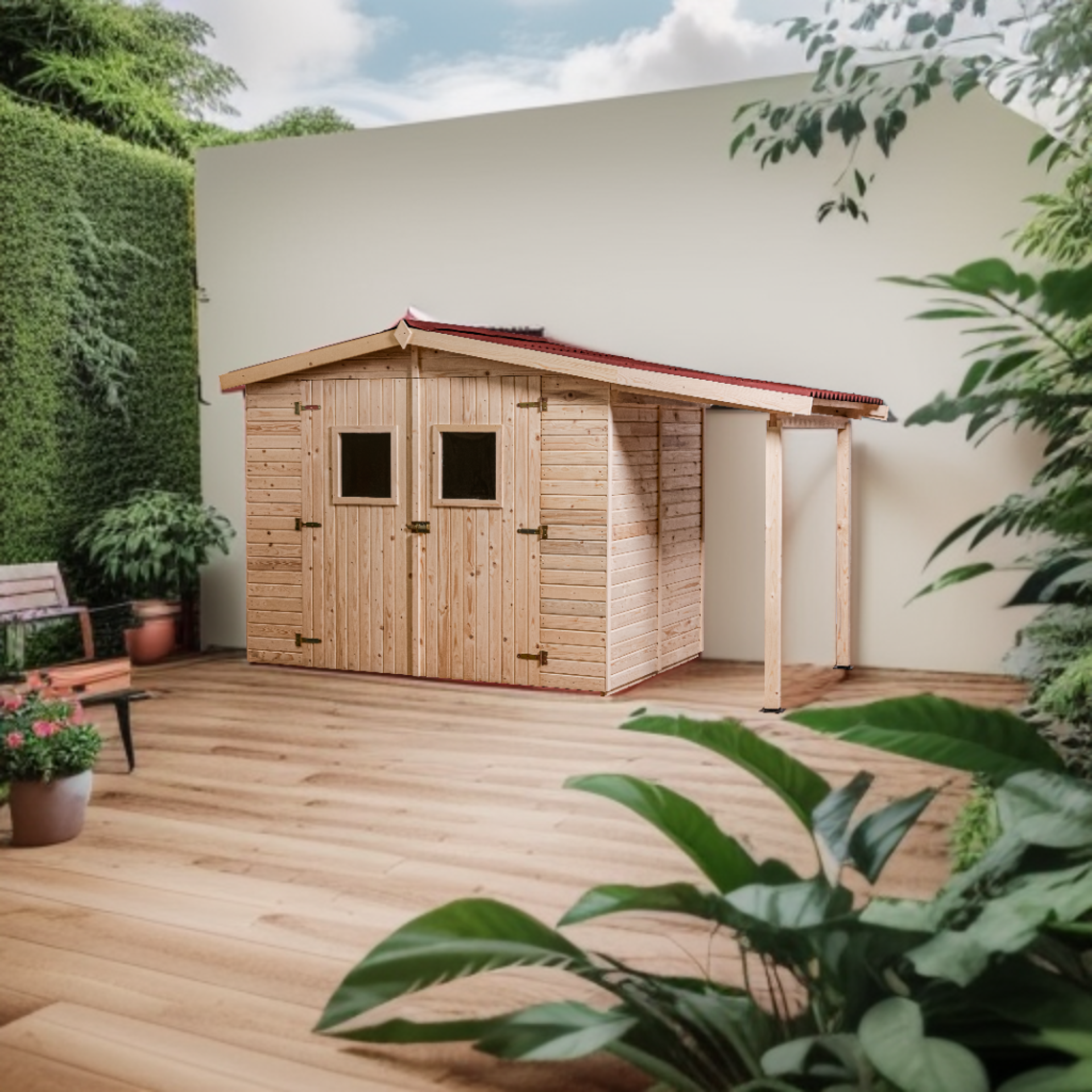 L'abri ED2416.01B est un abri en panneaux de 16 mm avec un plancher et un bûcher intégré. Il est facile à monter grâce à son système à panneau et est livré avec un toit en plaques ondulées pour une plus grande longévité. Le plancher est également inclus. Il offre le meilleur rapport qualité / prix avec son bûcher pour le stockage du bois ou des vélos. C'est un produit mixte fermé / ouvert fabriqué en Europe. Il doit être installé sur une dalle en béton obligatoirement.