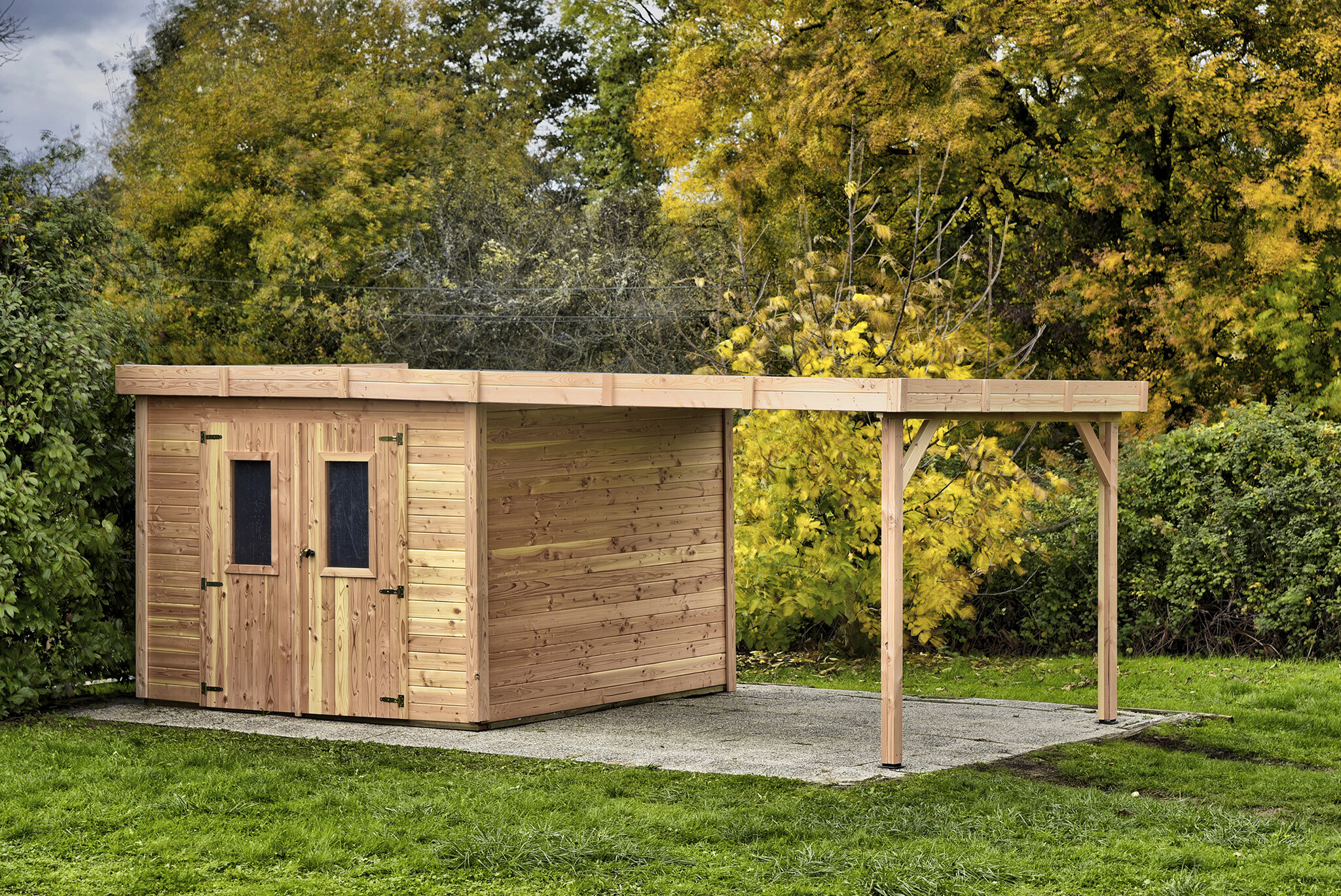 Abri SICILIA avec bûcher - Epicéa - Madriers 28mm - Toit plat polycarbonate