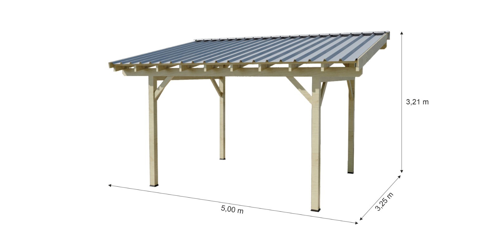 -4 poteaux et 2 pannes en épicéa du nord contrecollé, traité insecticide et fongicide CTBP+ incolore, raboté 4 faces et chanfreiné.