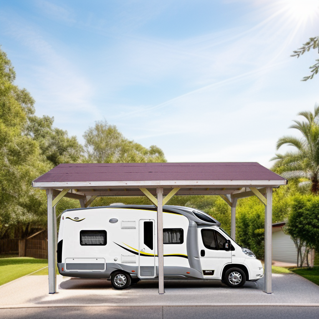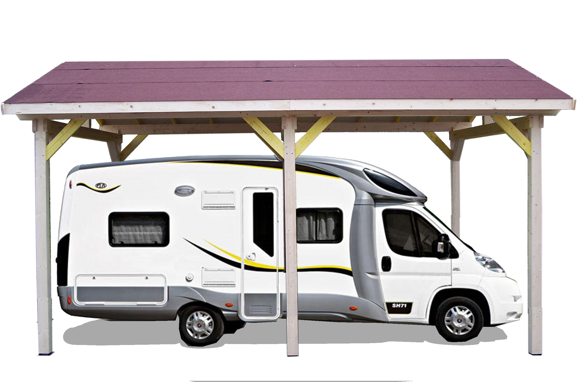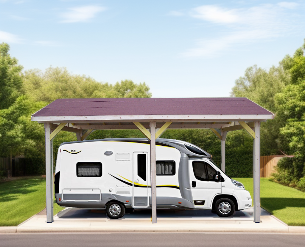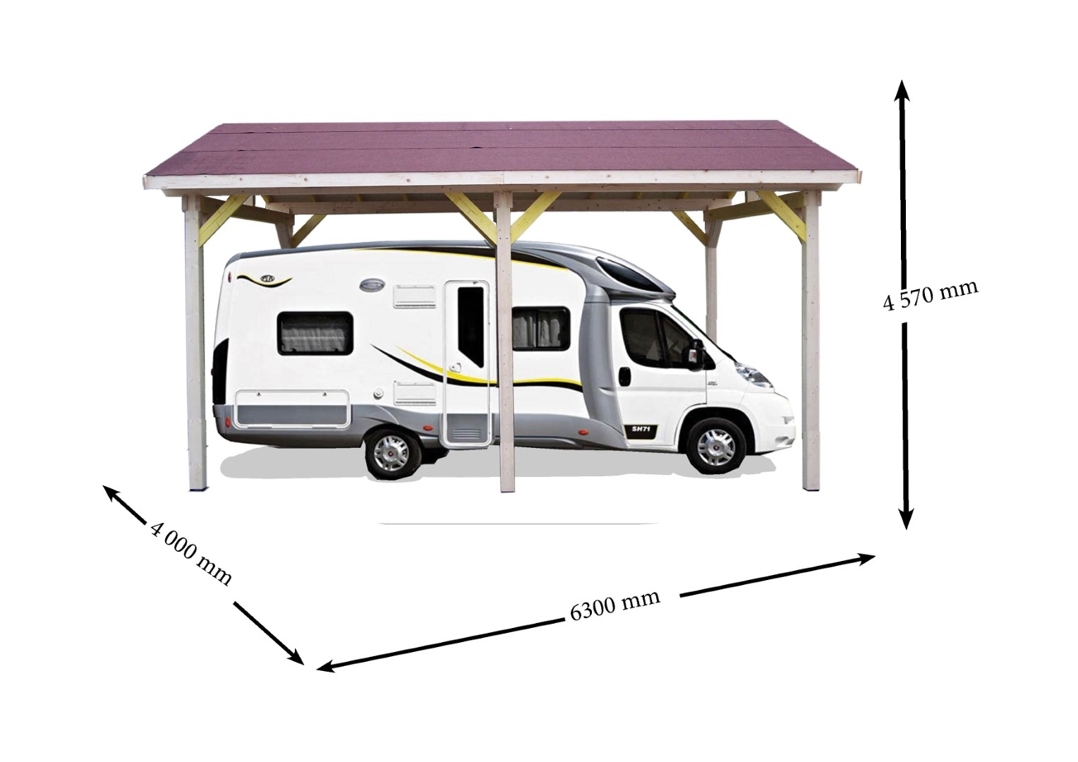 Le Carport double pente avec couverture bardeau bitumé en rouleau mesure 3,50 x 6,00 m. Il est conçu pour durer grâce à son assemblage par tenon et mortaise et à ses poteaux de très grosse section de 12x12 cm. Ce Carport est spécialement conçu pour les camping-cars. Il est fabriqué en France et certifié PEFC, garantissant la qualité de ses matériaux. Les poteaux sont livrés avec une platine métallique à fixer au sol dur pour une installation stable. Ce produit est garanti 2 ans et peut-être installé sur une dalle béton, des plots ou une terrasse en bois.
