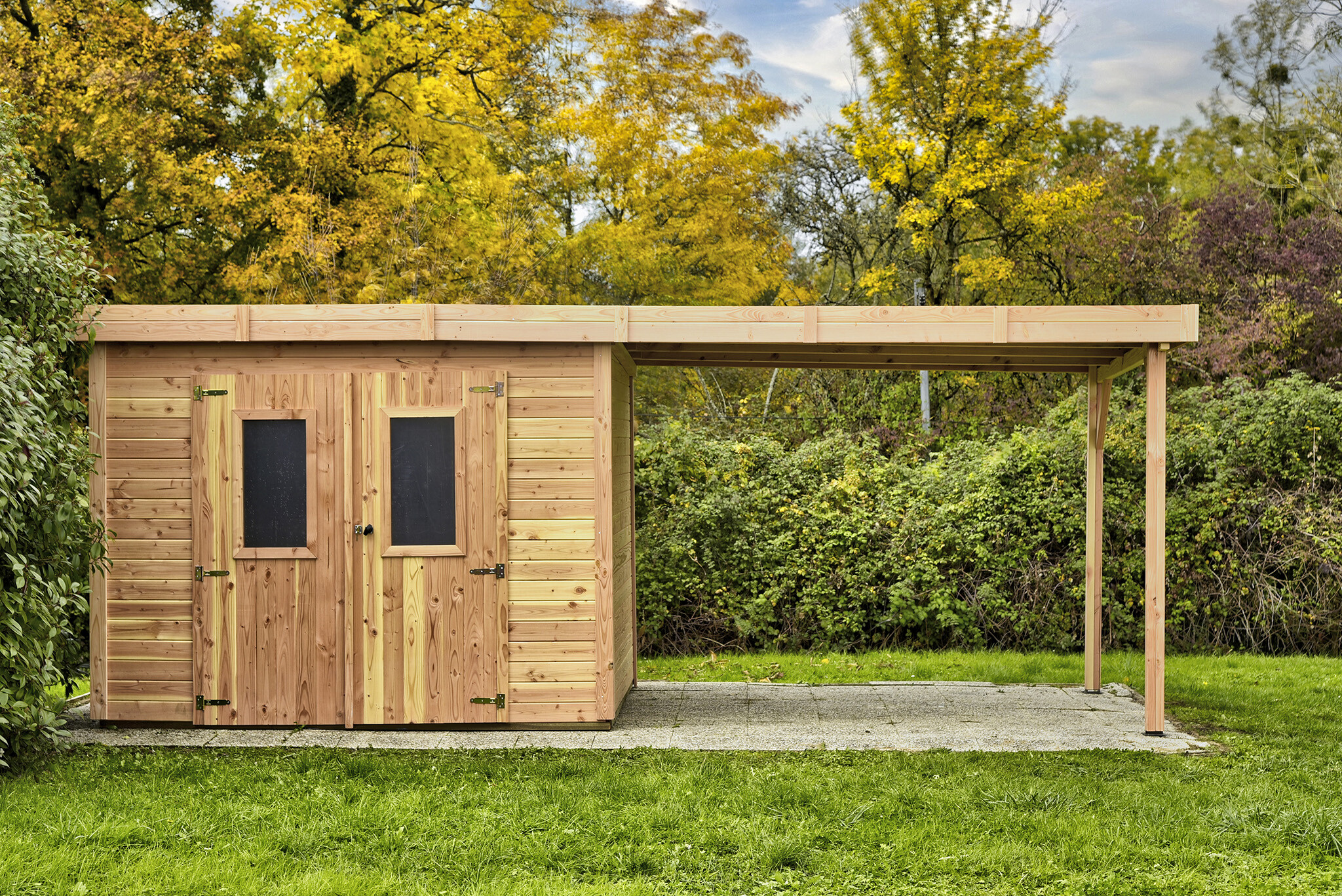 Abri DINAN avec bûcher - douglas - madriers 28mm toit plat - BAC ACIER