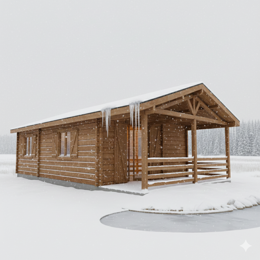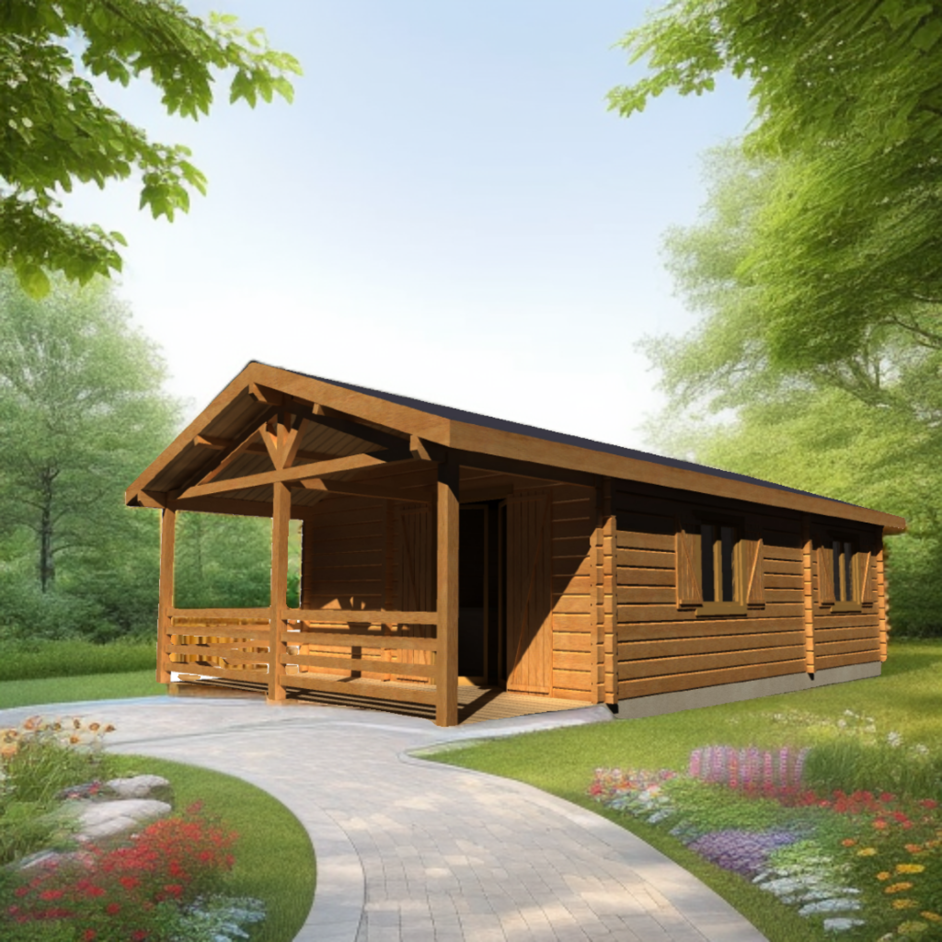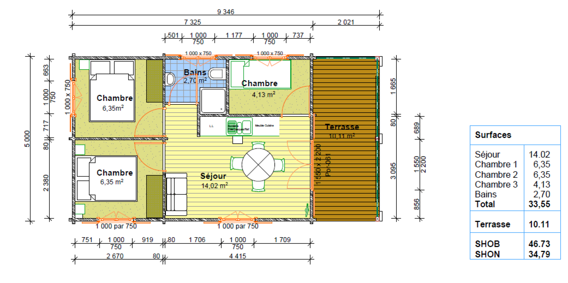 FORESTA fabrique et livre des constructions en bois de 80 mm d’épaisseur qui sont des structures solides qui peuvent servir de base à une habitation mais à condition d’effectuer des travaux supplémentaires d’isolation du toit, des murs, de la dalle, etc… de façon à répondre aux normes en vigueur qui permettent d’obtenir l’attestation RT2012, obligatoire pour obtenir le permis de construire pour habitation. La législation en vigueur prévoit un test d’étanchéité à la fin des travaux. Ces travaux sont à la charge du client et FORESTA ne peut pas être tenue responsable pour la qualité de l’ensemble de la construction finie. FORESTA ne délivre pas la garantie décennale. Le chalet ALABAMA se pose généralement sur une dalle béton à réaliser par le client. Afin de protéger le premier rang de madriers des murs contre les remontées d’humidité et de fixer au sol le chalet, FORESTA fourni un kit de soubassement en bois traité autoclave et feutre bitumé. La pose sur kit de soubassement permet d’obtenir un espace de 4 cm pour réaliser la finition du sol : chape et carrelage ou parquet bois. PAROIS Les parois de nos chalets sont fabriquées avec des madriers en sapin du nord contrecollé traité par immersion en usine classe II d’une épaisseur de 80 mm. Le profil des madriers est prévu pour un emboîtement entre eux grâce à des languettes et des rainures. Les assemblages d’angles sont des doubles encoches permettant d’obtenir une très bonne étanchéité. L’usinage est réalisé dans notre unité de production de NEVERS (France) sur un centre d’usinage à commande numérique moderne, extrêmement compétitif (matériel HUNDEGGER). Les murs seront posés et fixés sur une lisse basse en bois traitée autoclave. La lisse basse est fournie avec des fixations pour l’ancrer dans la dalle béton et un feutre bitumé pour couper les remontées d’humidité de la dalle en béton. Les parois en madriers sont livrées avec des tourillons en bois à placer dans des perçages verticaux (raidisseurs) afin de permettre le tassement de la construction tout en la renforçant. Des tiges filetées en acier avec des écrous sont également prévues pour renforcer les angles des parois. La structure de la maison (les parois) comporte des emplacements spécifiques pour accueillir l’installation électrique. Les perçages prévus permettent le passage des gaines après la pose de la maison. Un plan avec une proposition standard pour la pose de l’installation électrique est fourni. L’installation électrique n’est pas fournie avec la maison. Chacun des éléments composant les murs sera étiqueté individuellement afin de faciliter son identification lors de la pose. Les murs doivent être isolés pour correspondre aux normes en vigueur concernant une pièce d’habitation. Les travaux d’isolation par l’extérieur ou par l’intérieur sont à la charge du client. TOIT Construction avec une pente de toit à 20° supportant des tuiles de 45 kg/m² pour un emplacement situé en France, à une altitude inférieure ou égale à 900 m, dans une zone de neige 1 ou 2a. Composition de la charpente : pannes de section 190 mm x 80 mm en sapin du nord contrecollé traité par immersion en usine classe II, chevrons en sapin traité en usine par immersion classe II. Solivage en bois massif traité classe II section 120 x 45 mm fourni pour soutenir un éventuel plafond des chambres à faire par le client après avoir réalisé les travaux d’isolation. Finition des avant - toits en lambris sapin du nord sec section 9 x 105 mm fixés sur structures en bois de 95 x 45 mm. Pose de planches de rive en bois de section 21 x 170 mm. COUVERTURE Couverture en shingle auto collant (feutre bitumé renforcée de fibres de verre et colorée par des granulés minéraux) garantie 10 ans. Pose par clouage avec pointes spécifiques sur une volige de toit en dalles OSB 3 rainurées bouvetées épaisseur 15 mm. L’aspect « ardoises » et le choix de quatre couleurs (rouge flammé, vert, bleu ardoise et brun) permettent l’utilisation du produit dans toutes les régions de la France. Les gouttières et les descentes d’eau pluviale ne sont pas fournies. La toiture doit être isolée pour correspondre aux normes en vigueur concernant une pièce d’habitation. Les travaux d’isolation sont à la charge du client. Pour éviter les ponts thermiques, nous conseillons une isolation entre les chevrons épaisseur 100 mm croisée avec une deuxième couche d’isolant entre les pannes épaisseur 100 mm. MENUISERIES Les menuiseries extérieures sont en sapin contrecollé traité insecticide, fongicide et hydrofuge à double vitrage 4 – 12 – 4 mm : - 5 fenêtres dimensions 100 x 75 cm, sapin traité insecticide fongicide et hydrofuge à double vitrage 4 – 12 – 4 mm - 1 porte fenêtre sapin traité insecticide fongicide et hydrofuge dimensions 155 x 220 cm à double vitrage 4 – 12 – 4 mm, avec fermeture 5 points - 4 portes intérieures en bois 73 x 204 cm. Quincaillerie : toute quincaillerie nécessaire à la menuiserie prévue. Les menuiseries se posent dans un pré-cadre bois qui est lui-même fixé dans la réservation prévue dans la paroi. Le pré-cadre est fourni aux dimensions spécifiques de la menuiserie et permet le tassement de la construction en madriers tout en protégeant les menuiseries. L’étanchéité entre le pré-cadre et les parois est réalisée avec une mousse PU à cellules ouvertes imprégnée à cœur d'une résine acrylique stable ACRYL 300 10 x 15mm. Les volets pour les fenêtres sont fournis dans le prix de base. Ils sont en bois massif, de type barre / écharpe. La quincaillerie des volets est prévue. La porte fenêtre est prévue avec un volet bois amovible. TERRASSE Terrasse en bois non couverte. Lames de terrasse en pin traité autoclave section 95 x 20 mm. Un poteau en sapin du nord contrecollé, traité par immersion dans l’usine class