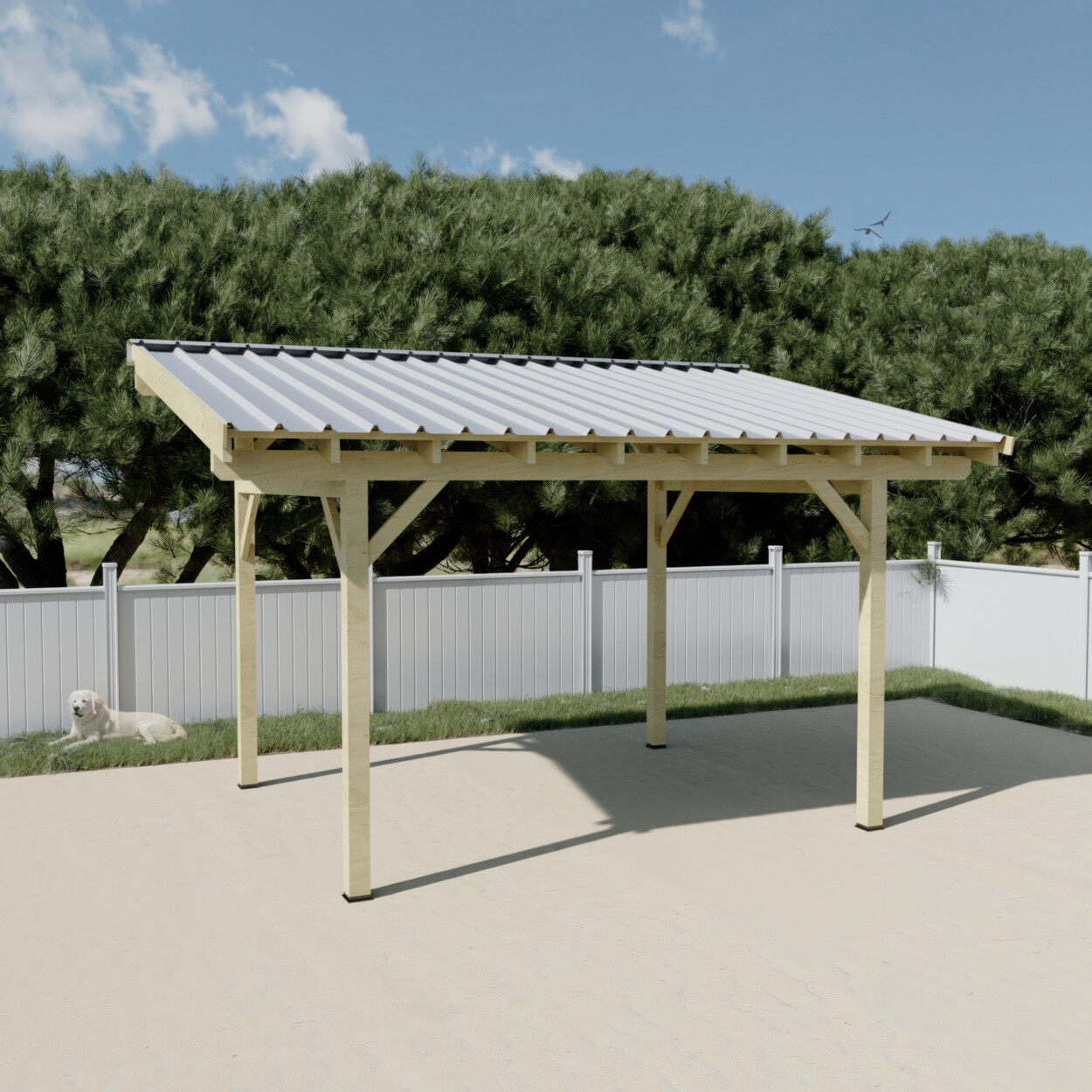 -4 poteaux et 2 pannes en épicéa du nord contrecollé, traité insecticide et fongicide CTBP+ incolore, raboté 4 faces et chanfreiné.