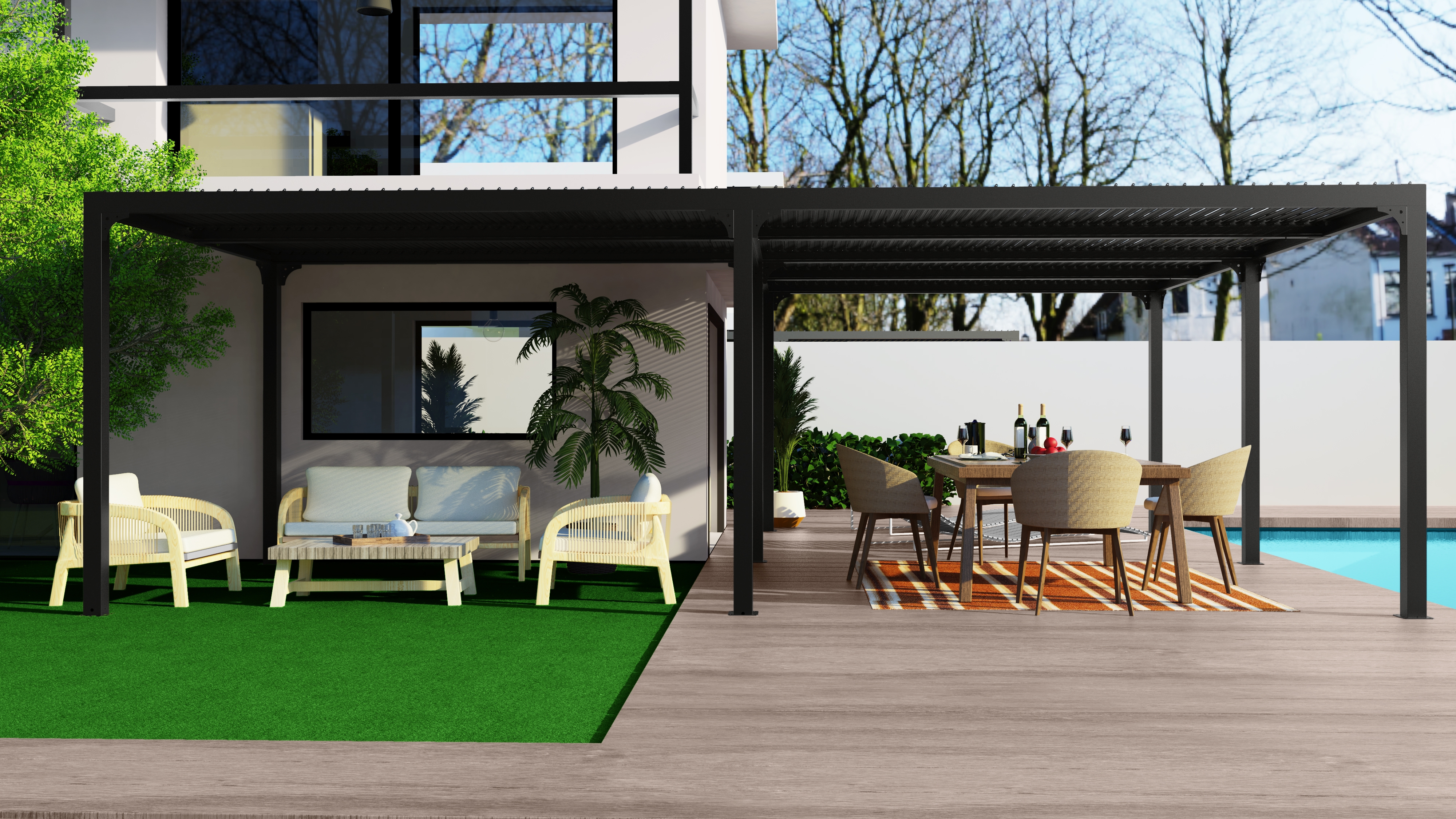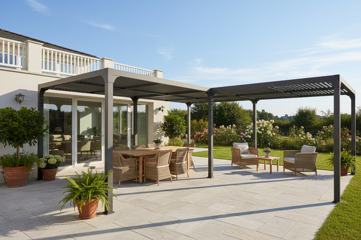 | - Ajustement de l'ouverture indépendante des 2 côtés du toit de la pergola | |