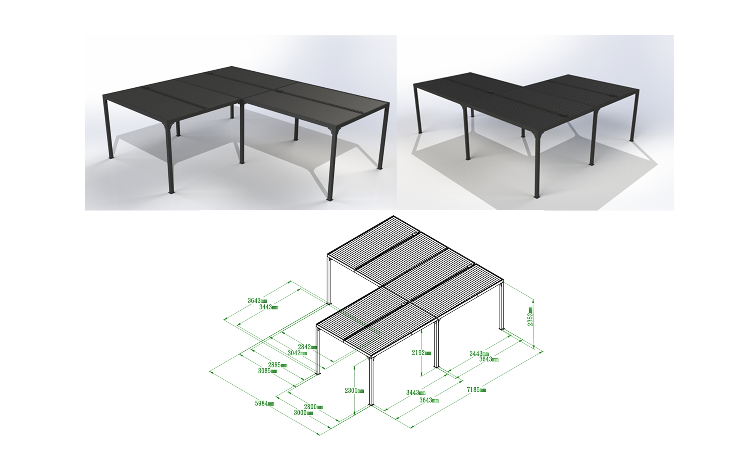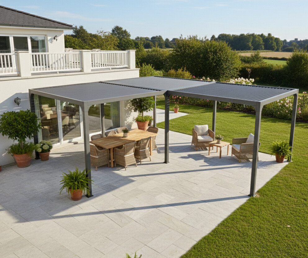 Pergola bioclimatique en "L" avec ventelles sur le toit, Aluminium gris anthracite, 7.10 x 6.00 x 3.60 x 3.00 x 3.60 x 3.00 m, 3